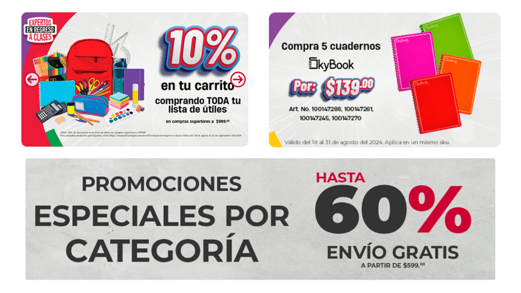 Office Depot es una de las tiendas líderes en México en la venta de artículos de oficina y escolares. Durante la temporada de regreso a clases, la tienda implementa una serie de estrategias de mercadotecnia y promociones atractivas, como: